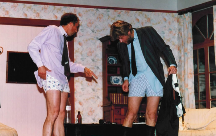 Costumes contemporains. Attention : les pantalons de Patrick et de Bernard s’échangent au cours de l’acte 1.