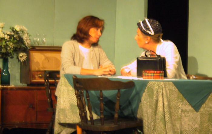 Décor un seul, arrière-boutique d’une épicerie, meublée simplement, deux entrées.