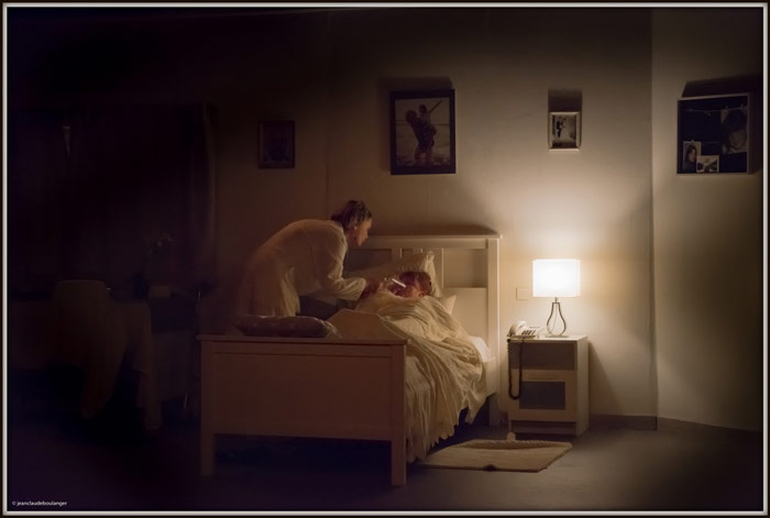 Décor un seul, chambre de pensionnaire dans une maison de retraite avec le mobilier, lit, armoire, télé, table de nuit, … Deux sorties, vers salle de bain et vers couloir. Déco habituelle, photos de famille